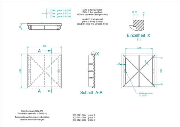 Full Description: A ribbed design gives you rigidity with minimum weight, and a special cast iron confers a high degree of wear resistance. ; Mass [kg]: 35; Remarks: Accuracy Grade 1; Accuracy [?m]: According to DIN 876 Grade 1 : fine scraped Grade?3 : fine planed; Dimensions L?x?W?x?H: 400 x 400 x 90;Product Link: https://shop.mitutoyo.eu/web/mitutoyo/en/mitutoyo/1300091726531/Cast%20Iron%20Surface%20Plate%2C%20DIN%20876/$catalogue/mitutoyoData/PR/902-302/index.xhtml
