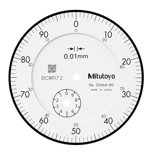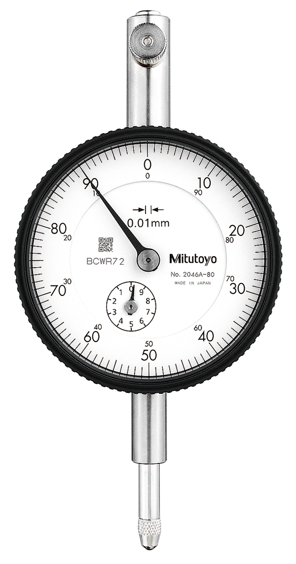 Full Description: This special dial indicators offer you the following benefits: In an adjustable pointer type the pointer can be adjusted independently of the position of the spindle by rotating the top knob. In a peak hold type a mechanism holds the pointer and the spindle at the position of maximum depression and hence displays the maximum value. ; Stem hole ?: 8 mm; Mass [g]: 149; Range [mm]: 10; Battery life: 12; Type: EN ISO Standard; Functions: 3; Inch-Metric: Metric; Delivered: With certificate of inspection; Range per rev.: 1 mm; EN ISO 463: Errors of indication over a range of (see below); MPE measuring range: 15; Contact point: Carbide tipped, thread: M 2.5 x 0.45 mm; Dial reading: ?0-100; Digital/Analog: Analog; fges: 15; Graduation: 0,01 mm; H MPE (Hysteresis): 3; Measuring force: 0,4-5; Range [mue]: 15; R MPE (Repeatability): 3; MPE any 1 revolution: 10; MPE any 1/2 revolution: 9; MPE any 1/10 revolution: 5; Continuous dial: Yes; Peak retaining: Yes;Product Link: https://shop.mitutoyo.eu/web/mitutoyo/en/mitutoyo/1294000485561/Dial%20Gauge%2C%20Flat%20Back%2C%20ISO%20Type/$catalogue/mitutoyoData/PR/2046AB-80/index.xhtml