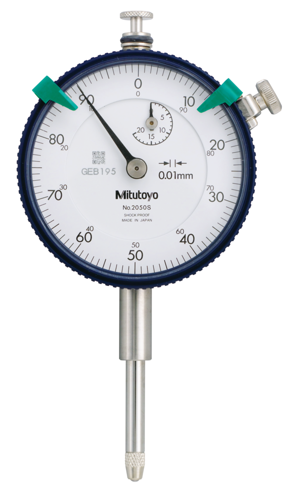 ; Stem hole ?: 8 mm; Magnetic stand size (LXWXH): 7.6; Base size (LxWxH): 75.2; Clamping force (vertical): 16.9; Mass [g]: 140; Range [mm]: 20; Battery life: 25; Type: EN ISO Standard; Functions: 4; Inch-Metric: Metric; Delivered: With certificate of inspection; Range per rev.: 1 mm; EN ISO 463: Errors of indication over a range of (see below); MPE measuring range: 20; Contact point: Carbide tipped, thread: M 2.5 x 0.45 mm; Dial reading: ?0-100; fges: 30; Graduation: 0.01; H MPE (Hysteresis): 4; Measuring force: 0,4-2; Range [mue]: 20; R MPE (Repeatability): 3; MPE any 1 revolution: 11; MPE any 1/2 revolution: 10; MPE any 1/10 revolution: 6; Shockproof: Yes; Jeweled bearing: Yes; Continuous dial: Yes; Cushioned end point: Yes;Product Link: https://shop.mitutoyo.eu/web/mitutoyo/en/mitutoyo/1300888907515/Dial%20Gauge%2C%20Flat%20Back%2C%20ISO%20Type/$catalogue/mitutoyoData/PR/2050AB-19/index.xhtml