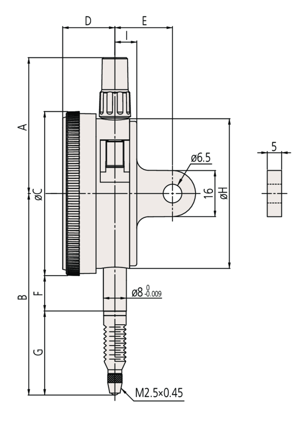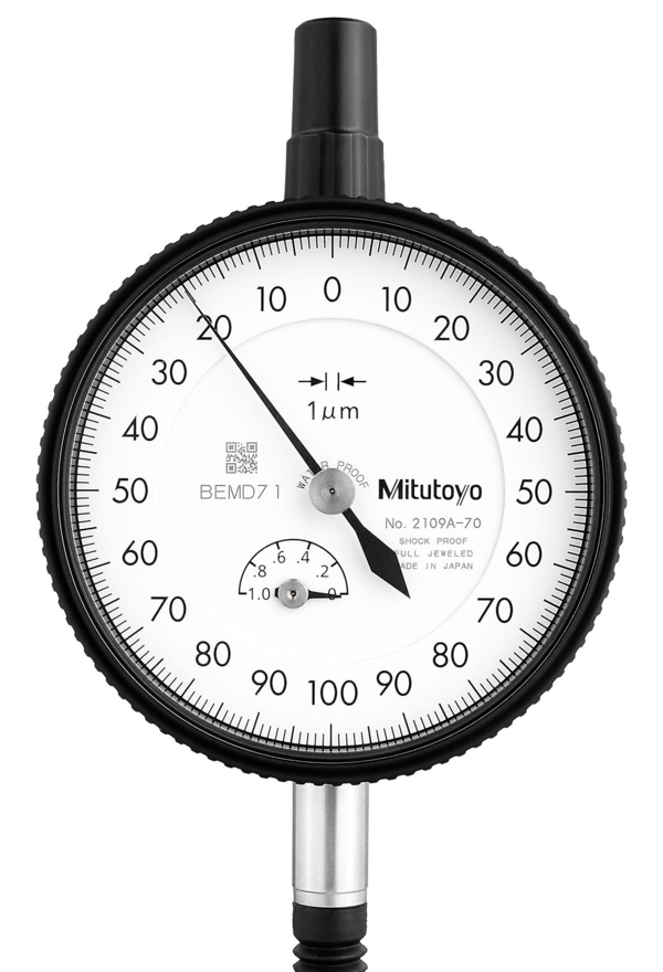 ; Stem hole ?: 8 mm; Magnetic stand size (LXWXH): 7.6; Base size (LxWxH): 65.3; Clamping force (vertical): 12.3; Mass [g]: 140; Range [mm]: 1; Battery life: 3; Type: EN ISO Standard; Functions: 2; Inch-Metric: Metric; Delivered: With certificate of inspection; Range per rev.: 0.2 mm; Balanced dial: Yes; EN ISO 463: Errors of indication over a range of (see below); MPE measuring range: 5; Contact point: Carbide tipped, thread: M 2.5 x 0.45 mm; Dial reading: 0-100-0; Digital/Analog: Analog; fges: 5; Graduation: 0.001; H MPE (Hysteresis): 2; Measuring force: 0,4-2; Range [mue]: 5; R MPE (Repeatability): 1; MPE any 1 revolution: 4.5; MPE any 1/2 revolution: 4; MPE any 1/10 revolution: 2.5; Shockproof: Yes; Jeweled bearing: Yes; IP64: Yes;Product Link: https://shop.mitutoyo.eu/web/mitutoyo/en/mitutoyo/1300888710750/Dial%20Gauge%2C%20Flat%20Back%2C%20ISO%20Type/$catalogue/mitutoyoData/PR/2109AB-70/index.xhtml