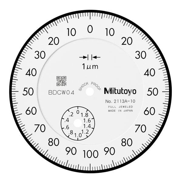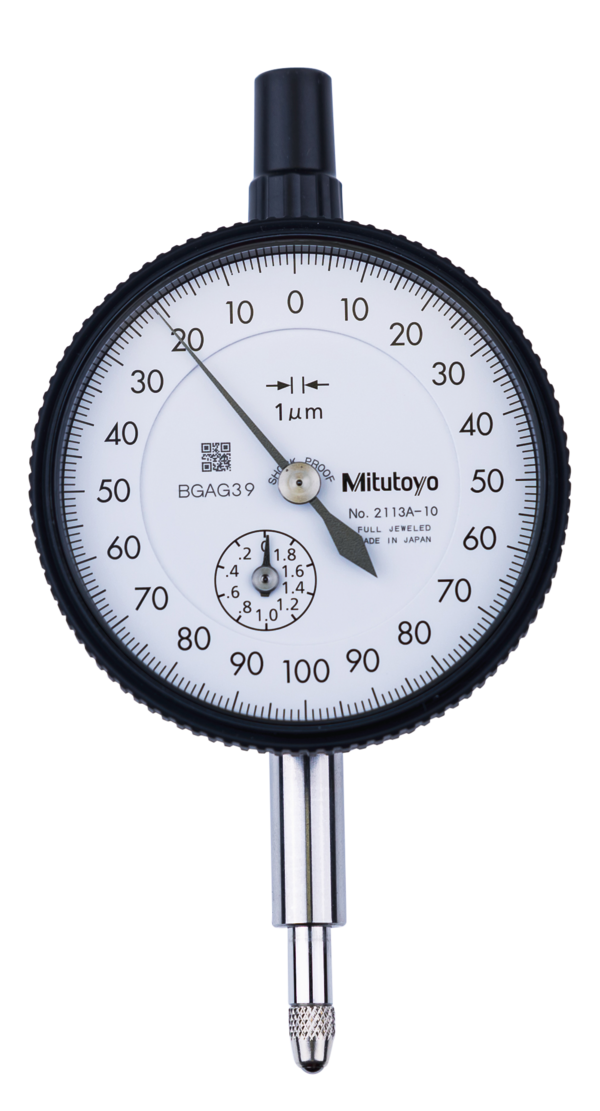 ; Stem hole ?: 8 mm; Magnetic stand size (LXWXH): 7.6; Base size (LxWxH): 61; Clamping force (vertical): 16.9; Mass [g]: 139; Range [mm]: 2; Battery life: 5; Type: EN ISO Standard; Functions: 2; Inch-Metric: Metric; Delivered: With certificate of inspection; Range per rev.: 0.2 mm; Balanced dial: Yes; EN ISO 463: Errors of indication over a range of (see below); MPE measuring range: 7; Contact point: Carbide tipped, thread: M 2.5 x 0.45 mm; Dial reading: 0-100-0; Digital/Analog: Analog; fges: 7; Graduation: 0.001; H MPE (Hysteresis): 2; Measuring force: 0,4-1,5; Range [mue]: 7; R MPE (Repeatability): 1; MPE any 1 revolution: 4.5; MPE any 1/2 revolution: 4; MPE any 1/10 revolution: 2.5; Shockproof: Yes; Jeweled bearing: Yes;Product Link: https://shop.mitutoyo.eu/web/mitutoyo/en/mitutoyo/1300888710750/Dial%20Gauge%2C%20Flat%20Back%2C%20ISO%20Type/$catalogue/mitutoyoData/PR/2113AB-10/index.xhtml