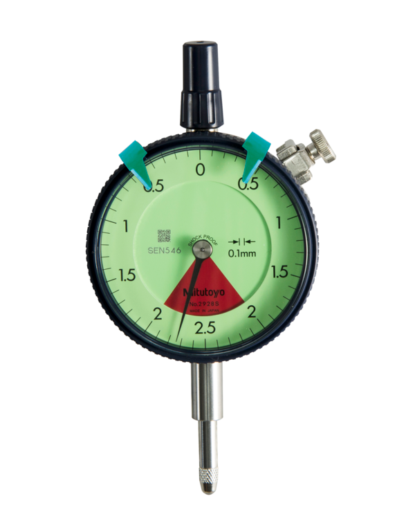 ; Stem hole ?: 8 mm; Magnetic stand size (LXWXH): 7.6; Base size (LxWxH): 65.2; Clamping force (vertical): 16.9; Mass [g]: 136; Range [mm]: 4; Battery life: 40; Type: EN ISO Standard; Functions: 5; Inch-Metric: Metric; Delivered: With certificate of inspection, limit indicators; Range per rev.: 5 mm; EN ISO 463: Errors of indication over a range of (see below); MPE measuring range: 25; Contact point: Carbide tipped, thread: M 2.5 x 0.45 mm; Dial reading: 2-0-2; Digital/Analog: Analog; fges: 50; Graduation: 0.1; H MPE (Hysteresis): 12; Measuring force: 0.4-1.4 N; Range [mue]: 25; R MPE (Repeatability): 20; MPE any 1/10 revolution: 15; Shockproof: Yes; Error of indication one revolution: Yes; Plunger Stroke: 10; Mass lug/plain: 145/136;Product Link: https://shop.mitutoyo.eu/web/mitutoyo/en/mitutoyo/1300889189890/Dial%20Gauge%2C%20Flat%20Back%2C%20ISO%20Type/$catalogue/mitutoyoData/PR/2928AB/index.xhtml