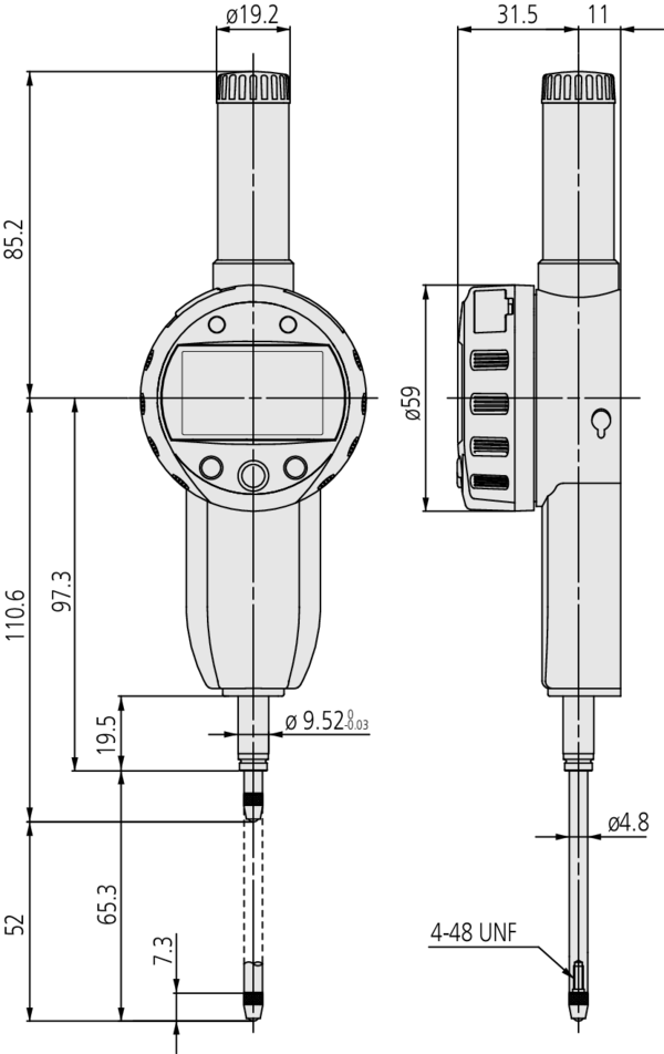 Full Description: This indicator allows you to use a calculation function for the measured value Ax+B+Cx -1 The integrated calculation formula is useful in a variety of applications (e.g. roll diameter measurement) Coefficients A,B and C are freely definable. X = displacement of the plunger Analogue bar graph in the display (14 different scales switchable) ? GO/?NG tolerance judgement function MAX/MIN/RANGE function to measure peak values A fast measurement frequency mode(detection cycle 20 ms or 50 times/s) is selectable to measure in the peak detection mode (MAX/MIN/RANGE) more reliably Easy indicator setup ?via a setup menu A USB interface box can be used to set up the indicator from PC via dedicated software ; Mass [g]: 260; Range [mm]: 50.8; Remarks: Digital step is switchable (12 steps); Power supply report: 1 battery CR2032; Battery life: Standard mode: approx. 1 year fast mode: approx. 4.5 month; Type: EN ISO Standard; Inch-Metric: Metric; Delivered: Including CR2032 battery, lifting handle, certificate of inspection; Contact point: Carbide ball, thread: M2.5×0.45; Digital/Analog: Digital; H MPE (Hysteresis): 0.002 mm; R MPE (Repeatability): 0.002 mm; Stem ?: 8 mm; Max. Permissible Error E MPE: 0.006 mm; Digital step: 0.001 mm (default setting), 12 steps; Display: LCD, character height 8 mm, 330? rotatable; Low voltage alarm: Low voltage, ABS composition error, overflow error, setting error; Max. response speed [mm/s]: Unlimited; Protection: IP42; PRESET: Yes; Counting direction switchable: Yes; Inch/Metric switchable: No; Max. Permissible Error E MPE (Total Range): 0.006 mm; Measuring force MPL: ?2.3 N; Measurement frequency (MAX/MIN/RANGE): Standard mode: 10 times/s fast mode: 50 times/s (plunger speed max. 50 ?m/s for peak measurement); Digital Scale: Electrostatic capacitance type absolute linear encoder;Product Link: https://shop.mitutoyo.eu/web/mitutoyo/en/mitutoyo/1300442507140/Digital%20Indicator%2C%20Calculation%20ID-C/$catalogue/mitutoyoData/PR/543-595B-10/index.xhtml