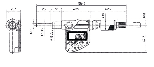 ; Stem hole ?: Plain; Mass [g]: 230; Range [mm]: 0 – 25; Remarks: IP65; Power supply report: 1 battery SR-44; Battery life: Approx. 2,4 years; Inch-Metric: Metric; Delivered: With battery SR-44; Digital/Analog: Digital; Max. Permissible Error J MPE: ?2 ?m; Accuracy [?m]: ?2; Measuring spindle: With spindle lock, ? 6,35 mm; Measuring face: Carbide tipped; Spindle end: Spherical (SR4); Stem ?: 12 /18 mm; Spindle pitch [mm]: 0,5; Digital step: 0,001 mm; Display: LCD, character Height 7.5 mm; Low voltage alarm: Yes;Product Link: https://shop.mitutoyo.eu/web/mitutoyo/en/mitutoyo/Digital%20Micrometer%20Head%20with%2012%20mm%20Stem/Digital%20Micrometer%20Head%2C%20IP65/$catalogue/mitutoyoData/PR/350-273-30/index.xhtml
