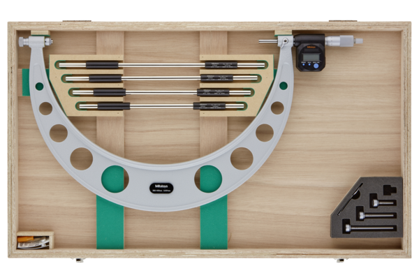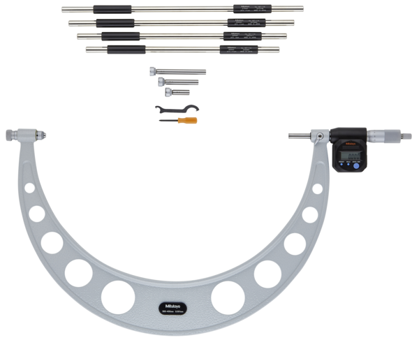 Full Description: This Digimatic Micrometer offers you an extra wide measuring range, and has the following benefits: Easy, interchangeable anvils allow a wide range of measurements. Ratchet stop for constant force. ; Mass [kg]: 2.6; Range [mm]: 300 – 400; Battery life: Approx. 2,4 years for models ?300 mm 1,8 years for >300 mm; Inch-Metric: Metric; Delivered: including box, gauge block, inserts, key, 1 battery; Digital/Analog: Digital; Measuring force: 10 – 14 N; Flatness: 1 ?m; Parallelism: 6 ?m; Accuracy [?m]: ?(4+L/75) ?m, L = max. range (mm); Min of Measuring force: 10; Max of Measuring force: 15; Measuring spindle: With spindle lock, ?6,35 mm (?300 mm) ? 8 mm (>300 mm) , spindle pitch 0,5 mm; Measuring face: Carbide tipped, micro-lap finish spindle and hardened steel anvil; Scale: thimble and sleeve satin chrome finish ?18 mm (up to 300 mm), ?21 mm (over 300 mm); Setting standard: 4 (300, 325, 350, 375 mm); Interchangeable anvils: 4; Limit of error: ?10 ?m; Spindle feed error [?m]: 3; Digital step: 0,001 mm; Low voltage alarm: Yes; Holding capacity [mm]: Yes; Data output: Yes; ABS / INC (INC ZERO): Yes; Function lock: Yes; 2 x PRESET: Yes; Auto Power OFF after 20 min. non use: Yes;Product Link: https://shop.mitutoyo.eu/web/mitutoyo/en/mitutoyo/01.02.01.044/Digital%20Micrometer%20Interchangeable%20Anvil/$catalogue/mitutoyoData/PR/340-520/index.xhtml