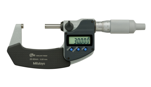 ; Stem hole ?: 25; Magnetic stand size (LXWXH): 2.5; Base size (LxWxH): 9.8; Mass [g]: 330; Range [mm]: 25 – 50; Battery life: Approx. 2.4 years for models ?100 mm 1.2 years for >100 mm; Functions: With ratchet thimble; Inch-Metric: Metric; Delivered: including Box, key, 1 battery, gauge block (from 25 mm upward), up to 50 mm measuring range with factory certificate; Digital/Analog: Digital; Flatness: 0,3 ?m; Max. Permissible Error J MPE: ?1 ?m; Parallelism: 1 ?m; Accuracy [?m]: ?1; Measuring spindle: With spindle lock, ?6.35 mm, spindle pitch 0.5 mm; Measuring face: Carbide-tipped, micro-lap finish; Scale: Thimble and sleeve satin chrome finish, ?18 mm; Digital step: 0.001 mm; Data output: No;Product Link: https://shop.mitutoyo.eu/web/mitutoyo/en/mitutoyo/01.02.01.0/Digital%20Micrometer%20IP65/$catalogue/mitutoyoData/PR/293-245-30/index.xhtml