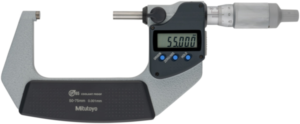 ; Stem hole ?: 50; Magnetic stand size (LXWXH): 2.5; Base size (LxWxH): 47; Mass [g]: 470; Range [mm]: 50 – 75; Battery life: Approx. 2,4 years for models ?100 mm 1,2 years for >100 mm; Functions: With ratchet thimble; Inch-Metric: Metric; Delivered: including Box, key, 1 battery, gauge block (from 25 mm upward), up to 50 mm measuring range with factory certificate; Digital/Analog: Digital; Flatness: 0,3 ?m; Max. Permissible Error J MPE: ?2 ?m; Parallelism: 2 ?m; Accuracy [?m]: ?1; Measuring spindle: With spindle lock, ?6,35 mm, spindle pitch 0,5 mm; Measuring face: Carbide-tipped, micro-lap finish; Scale: Thimble and sleeve satin chrome finish, ?18 mm; Digital step: 0,001 mm; Data output: Yes;Product Link: https://shop.mitutoyo.eu/web/mitutoyo/en/mitutoyo/01.02.01.0/Digital%20Micrometer%20IP65/$catalogue/mitutoyoData/PR/293-236-30/index.xhtml