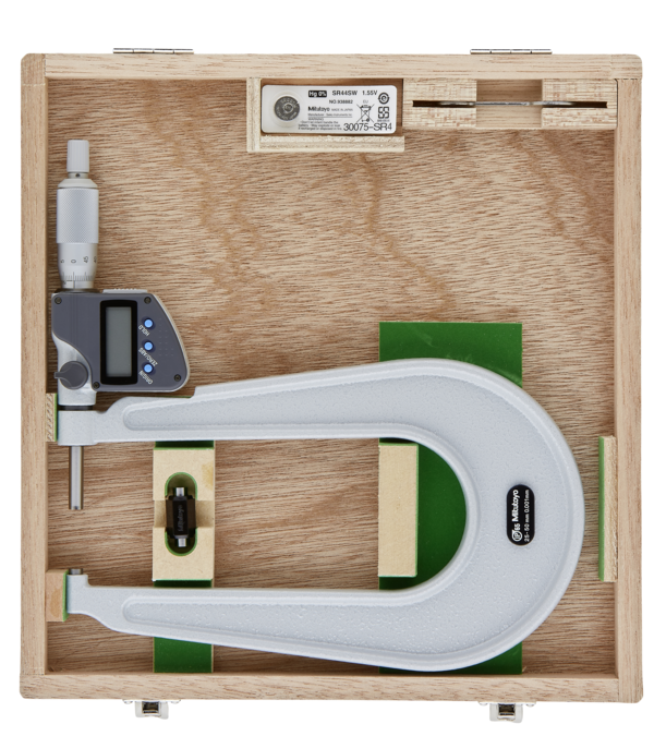 Full Description: This Digimatic Sheet Metal Micrometer is designed with a deep frame, for measuring the thickness of sheet material.; Mass [g]: 920; Range [mm]: 25 – 50; Battery life: Approx. 2,4 years, approx. 1,8 years (389-514); Inch-Metric: Metric; Delivered: Including box. key, 1 battery; Digital/Analog: Digital; Measuring force: 3 – 8 N; Flatness: 0,6 ?m; Max. Permissible Error J MPE: ?4 ?m; Parallelism: 3 ?m; Accuracy [?m]: ?4; Min of Measuring force: 3; Max of Measuring force: 8; Measuring spindle: With spindle lock, ?6,35 mm, spindle pitch 0,5 mm; Measuring face: Carbide-tipped, micro-lap finish; Scale: Thimble and sleeve satin chrome finish, ?18 mm; Anvil / Spindle: Type A, flat/flat; Digital step: 0,001 mm; Protection IP65: Yes;Product Link: https://shop.mitutoyo.eu/web/mitutoyo/en/mitutoyo/01.02.01.066/Digital%20Sheet%20Metal%20Micrometer%20IP65/$catalogue/mitutoyoData/PR/389-252-30/index.xhtml