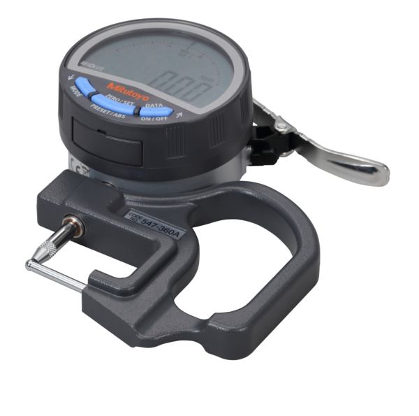 ; Mass [g]: 230; Range [mm]: 0 – 10; Power supply report: 1 battery CR2032 (3V); Type: Anvil D=3.5 mm, contact point D=3 mm (flat); Functions: With indicator ID-C No.543.0-710.0BS; Inch-Metric: Metric; Delivered: Including box; Digital/Analog: Digital; Digital step: 0.01 mm; Display: LCD, character height 11 mm; Low voltage alarm: Low voltage, setting errors, sensor error, display overflow a.s.o.; Max. response speed [mm/s]: Unlimited; Protection: IP42; Measurement frequency (MAX/MIN/RANGE): Yes; Digital Scale: Electrostatic capacitance type absolute linear encoder; Digital step switchable: No; Indicator No.: 543-710BS; Max. measuring depth: 20 mm;Product Link: https://shop.mitutoyo.eu/web/mitutoyo/en/mitutoyo/1303825829093/Digital%20Thickness%20Gauge%2C%20Pipe%20Gauge/$catalogue/mitutoyoData/PR/547-360A/index.xhtml