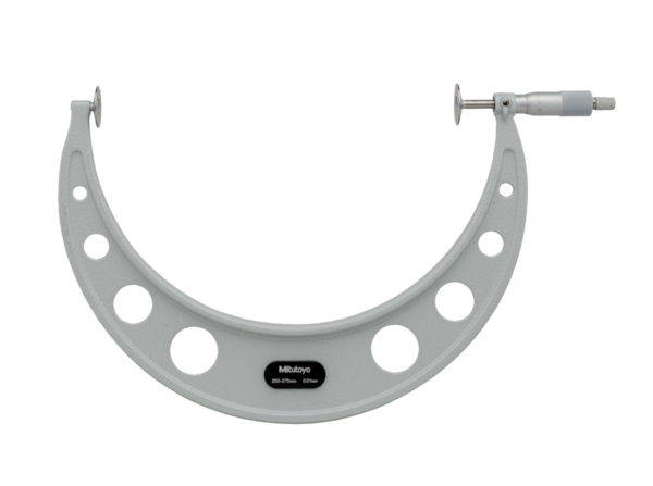 Full Description: This Disc Micrometer enables you to measure hard-to-reach features, offering you the following benefits: Measuring the root tangent length of spur and helical gears. You can measure recessed features that are difficult to reach with a standard micrometer. ; Stem hole ?: 1; Magnetic stand size (LXWXH): 30; Base size (LxWxH): 15; Mass [g]: 1410; Range [mm]: 250 – 275; Inch-Metric: Metric; Delivered: Including box, setting standard (from 25 mm upward), key; Digital/Analog: Analog; Graduation: 0,01 mm; Flatness: 1,6 ?m; Max. Permissible Error J MPE: ?9 ?m; Parallelism: 9 ?m; Accuracy [?m]: ?9; Measuring spindle: With spindle lock, ?6,35 mm, spindle pitch 0,5 mm; Measuring face: Carbide-tipped (123-113, -114, -115, -116) or hardened steel spindle and anvil; Scale: Thimble and sleeve satin chrome finish, ?18 mm; Measurable module: 0.7 – 11;Product Link: https://shop.mitutoyo.eu/web/mitutoyo/en/mitutoyo/01.02.01.061/Disc%20Micrometer%2C%20Hardened%20Steel%20Disks/$catalogue/mitutoyoData/PR/123-111/index.xhtml