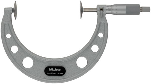 Full Description: This Disc Micrometer enables you to measure hard-to-reach features, offering you the following benefits: Measuring the root tangent length of spur and helical gears. You can measure recessed features that are difficult to reach with a standard micrometer. ; Stem hole ?: 1; Magnetic stand size (LXWXH): 30; Base size (LxWxH): 12; Mass [g]: 520; Range [mm]: 100 – 125; Inch-Metric: Metric; Delivered: Including box, setting standard (from 25 mm upward), key; Digital/Analog: Analog; Graduation: 0,01 mm; Flatness: 1,6 ?m; Max. Permissible Error J MPE: ?7 ?m; Parallelism: 7 ?m; Accuracy [?m]: ?7; Measuring spindle: With spindle lock, ?6,35 mm, spindle pitch 0,5 mm; Measuring face: Carbide-tipped (123-113, -114, -115, -116) or hardened steel spindle and anvil; Scale: Thimble and sleeve satin chrome finish, ?18 mm; Measurable module: 0.7 – 11;Product Link: https://shop.mitutoyo.eu/web/mitutoyo/en/mitutoyo/01.02.01.061/Disc%20Micrometer%2C%20Hardened%20Steel%20Disks/$catalogue/mitutoyoData/PR/123-105/index.xhtml