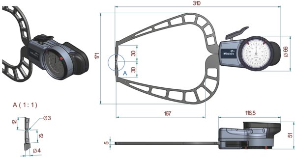 Full Description: This analog External Dial Caliper Gauge offers you the following benefits: Excellent resistance against water and dust (IP65 protection level) Optimized measuring force Ergonomically designed to lie securely in your hand when measuring ; Stem hole ?: 167; Mass [g]: 430; Range [mm]: 0 – 50; Type: Fig. 1; Functions: Measuring contacts: bevel radius 0,4 mm (209-405), 0,75 mm (209-921); Inch-Metric: Metric; Graduation: 0.05; Measuring force: 0,8-1,7; Accuracy [?m]: 0,05 mm; L (1) : 167; Hb: 30; Hf: 30;Product Link: https://shop.mitutoyo.eu/web/mitutoyo/en/mitutoyo/1305632905288/External%20Dial%20Caliper%20Gauge/$catalogue/mitutoyoData/PR/209-921/index.xhtml