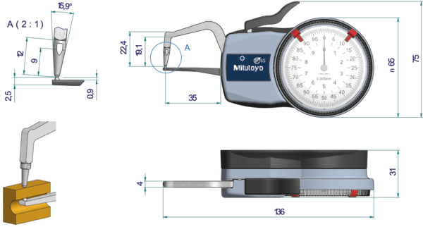 Full Description: This analog External Dial Caliper Gauge offers you the following benefits: Excellent resistance against water and dust (IP65 protection level) Optimized measuring force Ergonomically designed to lie securely in your hand when measuring ; Stem hole ?: 35; Mass [g]: 165; Range [mm]: 0 – 10; Type: Fig. 6; Functions: Measuring contacts: carbide ball ? 1,5 mm / bevel radius 0,4 mm; Inch-Metric: Metric; Graduation: 0.005; Measuring force: 0,8-1,2; Accuracy [?m]: 0,015 mm; L (1) : 35; Hb: 18.8; Hf: 0.9;Product Link: https://shop.mitutoyo.eu/web/mitutoyo/en/mitutoyo/1305632905288/External%20Dial%20Caliper%20Gauge/$catalogue/mitutoyoData/PR/209-401/index.xhtml