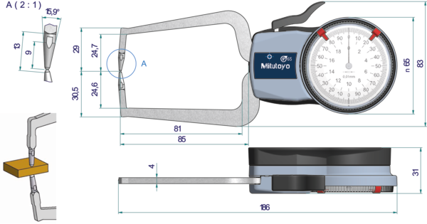 Full Description: A Mitutoyo external dial caliper gauge. The caliper is spring loaded and makes point contact at constant measuring force.; Stem hole ?: 80; Mass [g]: 200; Range [mm]: 0 – 20; Type: Fig. 3; Functions: Measuring contacts: carbide ball ? 1,5 mm / bevel radius 0,4 mm; Inch-Metric: Metric; Graduation: 0.01; Measuring force: 1,1-1,6; Accuracy [?m]: 0,03 mm; L (1) : 80; Hb: 24.7; Hf: 2.5;Product Link: https://shop.mitutoyo.eu/web/mitutoyo/en/mitutoyo/1305632905288/External%20Dial%20Caliper%20Gauge/$catalogue/mitutoyoData/PR/209-406/index.xhtml
