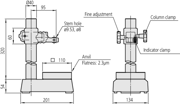 Full Description: Mitutoyo Comparator Stands consists of a very stable, cast-iron base and upright column with a mounting bracket that features fine adjustment. The grid type anvil prevents very flat workpieces from wringing to it.; Stem hole ?: ? 3/8″ / 9.53 mm , 8 mm with bush (standard accessory); Fine adjustment: 1; Mass [kg]: 10.9; Max. measurement height : 235; Effective table dimensions: 110 x 110; Column ?: 40; Perpendicularity table-stem hole: 0,4/100 mm; Table flatness: 2,3 ?m;Product Link: https://shop.mitutoyo.eu/web/mitutoyo/en/mitutoyo/01.05.01/Gauge%20Stand%20with%20Hardened%20Steel%20Anvil/$catalogue/mitutoyoData/PR/215-405-10/index.xhtml