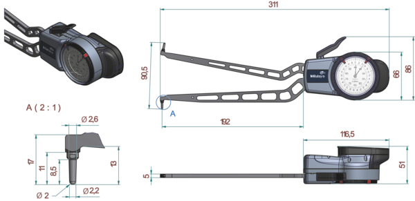 Full Description: This analog Internal Dial Caliper Gauge offers you the following benefits: Excellent resistance against water and dust (IP65 protection level) Optimized measuring force Ergonomically designed to lie securely in your hand when measuring ; Stem hole ?: 192; Magnetic stand size (LXWXH): 8.3; Base size (LxWxH): 2.4; Mass [g]: 370; Range [mm]: 40 – 90; Type: Fig. 3; Functions: Measuring contacts: carbide ball ? 2 mm; Inch-Metric: Metric; Graduation: 0.05; Measuring force: 0,9-1,9 ; Accuracy [?m]: 0,05 mm; L (1) : 192; L mm: 192;Product Link: https://shop.mitutoyo.eu/web/mitutoyo/en/mitutoyo/1306327061971/Internal%20Dial%20Caliper%20Gauge/$catalogue/mitutoyoData/PR/209-902/index.xhtml