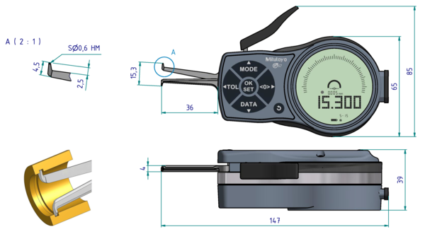 Full Description: Digital Caliper Gauge enables measurements in hard-to-reach places Excellent resistance against water and dust IP67 level ; Stem hole ?: 35; Magnetic stand size (LXWXH): 2.3; Base size (LxWxH): 0.8; Mass [g]: 260; Range [mm]: 5 – 15; Power supply report: 2 batteries LR03 (AAA); Type: Fig. 4; Functions: Measuring contacts: carbide ball ? 0,6 mm; Delivered: Including 2 batteries LR3, certificate of inspection; Graduation: 0.005; Measuring force: 0,8-1,2; Accuracy [?m]: 0,015 mm; Digital step: 0,001/0,002/0,005/0,01 mm; L (1) : 35; Protection: IP67;Product Link: https://shop.mitutoyo.eu/web/mitutoyo/en/mitutoyo/1306401566299/Internal%20Digital%20Caliper%20Gauge/$catalogue/mitutoyoData/PR/209-935/index.xhtml