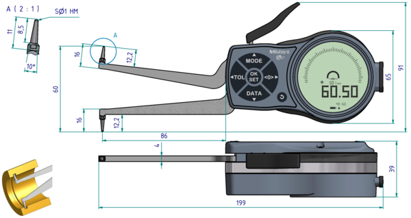 Full Description: Digital Caliper Gauge enables measurements in hard-to-reach places Excellent resistance against water and dust IP67 level ; Stem hole ?: 85; Magnetic stand size (LXWXH): 8.3; Base size (LxWxH): 1.2; Mass [g]: 285; Range [mm]: 40 – 60; Power supply report: 2 batteries LR3 (AAA); Type: Fig. 3; Functions: Measuring contacts: carbide ball ? 1 mm; Delivered: Including 2 batteries LR3, certificate of inspection; Graduation: 0.01; Measuring force: 1,1-1,6; Accuracy [?m]: 0,03 mm; Digital step: 0,001/0,002/0,005/0,01 mm; L (1) : 85; Protection: IP67;Product Link: https://shop.mitutoyo.eu/web/mitutoyo/en/mitutoyo/1306401566299/Internal%20Digital%20Caliper%20Gauge/$catalogue/mitutoyoData/PR/209-939/index.xhtml