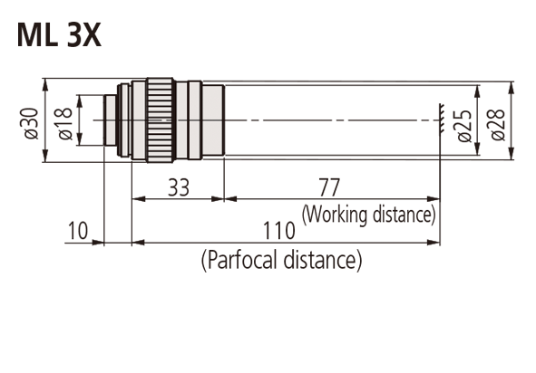Full Description: The Mitutoyo 375 Series finity corrected objective lenses realize clear images and long working distance.; Thread Arm/Base: 3.06; Mass [g]: 55; Model: ML 3X; Magnification: 3x; W.D.: 77; D.F.: 34; Dimensions [mm]: 30-30; Finite/Infinite: Finite; Image Field: visible: 24 mm; N.A.: 0.09; Specifications: MI1,566; Working distance: In Air: 77 mm;Product Link: https://shop.mitutoyo.eu/web/mitutoyo/en/mitutoyo/1358419146666/ML%20Objective%20Lens%203X/$catalogue/mitutoyoData/PR/375-037-1/index.xhtml