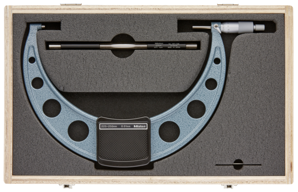 Full Description: A Mitutoyo basic, cost effective, non-digital micrometer with a ratchet stop to guarantee repeatable measurement.; Stem hole ?: 258; Magnetic stand size (LXWXH): 6.35; Base size (LxWxH): 18; Mass [g]: 1255; Range [mm]: 225-250; Functions: Graduation 0,01 mm; Inch-Metric: Metric; Delivered: Including box,?setting standard?(from 25 mm upward), key, certificate of inspection (0-50 mm range); Digital/Analog: Analog; Graduation: 0,01 mm; Measuring force: 5 – 15 N; Flatness: 0,6 ?m; Max. Permissible Error J MPE: ?5 ?m; Parallelism: 4 ?m; Accuracy [?m]: ?5; Min of Measuring force: 5; Max of Measuring force: 10; Measuring spindle: With spindle lock, ?6,35 mm (?300 mm) ? 8 mm (>300 mm) , spindle pitch 0,5 mm; Measuring face: Carbide-tipped, micro-lap finish; Scale: Thimble and sleeve satin chrome finish, ?18 mm (?300 mm), ?21 mm (>300 mm);Product Link: https://shop.mitutoyo.eu/web/mitutoyo/en/mitutoyo/01.02.01.031/Outside%20Micrometer%20Economy%20Design/$catalogue/mitutoyoData/PR/103-146-10/index.xhtml