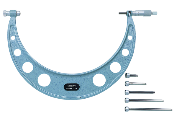 Full Description: A Mitutoyo non-digital micrometer provided with easily interchangeable anvils to enable a wide measuring range from one instrument. A ratchet stop guarantees repeatable measurement.; Stem hole ?: 18; Mass [kg]: 2.65; Range [mm]: 150 – 300; Inch-Metric: Metric; Delivered: Including box, setting standard, anvils, key; Digital/Analog: Analog; Graduation: 0,01 mm; Measuring force: 5 – 10 N; Flatness: 0,6 ?m; Parallelism: 5 ?m; Accuracy [?m]: ?(4+L/75) ?m, L = max. range (mm); Min of Measuring force: 5; Max of Measuring force: 10; Measuring spindle: With spindle lock, ?6,35 mm (?300 mm) ? 8 mm (>300 mm) , spindle pitch 0,5 mm; Measuring face: Carbide-tipped micro-lap finish spindle and hardened steel anvil; Scale: Thimble and sleeve satin chrome finish, ?18 mm (?300 mm), ?21 mm (>300 mm); Setting standard: 6 (100, 125, 150, 175, 200, 225 mm); Interchangeable anvils: 6; Limit of error: ?8 ?m; Spindle feed error [?m]: 3;Product Link: https://shop.mitutoyo.eu/web/mitutoyo/en/mitutoyo/01.02.01.043/Outside%20Micrometer%20Interchangeable%20Anvil/$catalogue/mitutoyoData/PR/104-136A/index.xhtml