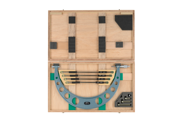 Full Description: A mitutoyo non-digital micrometer that accepts easily interchangeable anvils to enable a wide variety of measurement, such as tubing thickness, shoulder-edge distance and rivet height. A friction thimble guarantees repeatable measurement.; Stem hole ?: 21; Mass [kg]: 3.31; Range [mm]: 300 – 400; Inch-Metric: Metric; Delivered: Including box, setting standard, anvils, key; Digital/Analog: Analog; Graduation: 0,01 mm; Measuring force: 10 – 14 N; Flatness: 1 ?m; Parallelism: 6 ?m; Accuracy [?m]: ?(4+L/75) ?m, L = max. range (mm); Min of Measuring force: 10; Max of Measuring force: 14; Measuring spindle: With spindle lock, ?6,35 mm (?300 mm) ? 8 mm (>300 mm) , spindle pitch 0,5 mm; Measuring face: Carbide-tipped micro-lap finish spindle and hardened steel anvil; Scale: Thimble and sleeve satin chrome finish, ?18 mm (?300 mm), ?21 mm (>300 mm); Setting standard: 4 (300, 325, 350, 375 mm); Interchangeable anvils: 4; Limit of error: ?10 ?m; Spindle feed error [?m]: 3;Product Link: https://shop.mitutoyo.eu/web/mitutoyo/en/mitutoyo/01.02.01.043/Outside%20Micrometer%20Interchangeable%20Anvil/$catalogue/mitutoyoData/PR/104-142A/index.xhtml