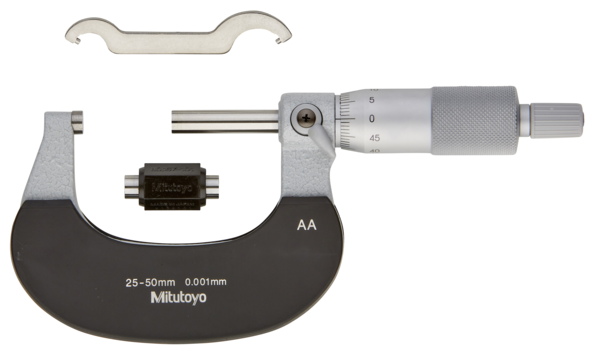 Full Description: Cut-away frame behind anvil for measuring in hard to reach places. A ratchet stop or friction thimble guarantees repeatable measurement. ; Stem hole ?: 25; Magnetic stand size (LXWXH): 2.5; Base size (LxWxH): 32; Mass [g]: 270; Range [mm]: 25 – 50; Remarks: Ratched Stop; Functions: Graduation 0,001 mm is obtained with vernier on sleeve; Inch-Metric: Metric; Delivered: Including box, key, setting standard (from 25 mm upward), certificate of inspection (0-50 mm range); Digital/Analog: Analog; Graduation: 0,001 mm; Flatness: 0,3 ?m; Max. Permissible Error J MPE: ?1 ?m; Parallelism: 1 ?m; Accuracy [?m]: ?1; Min of Measuring force: 5; Max of Measuring force: 10; Measuring spindle: With spindle lock, ?6,35 mm, spindle pitch 0,5 mm; Measuring face: Carbide-tipped, micro-lap finish; Scale: Thimble and sleeve satin chrome finish, ?18 mm;Product Link: https://shop.mitutoyo.eu/web/mitutoyo/en/mitutoyo/Outside%20Micrometer%20with%20Thermally%20Insulating%20Plate/Outside%20Micrometer%20with%20%20Heat%20Ins.%20Plate/$catalogue/mitutoyoData/PR/102-312/index.xhtml