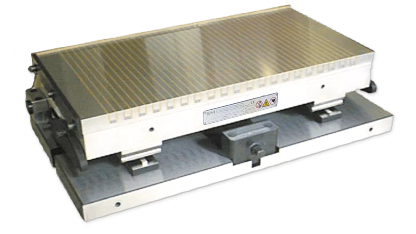 With sine table base plate in steel design. Stress-free annealed. All structural elements made of steel. Hardened and precision ground. Stable construction with high accuracy. Depending on size with mechanical adjustment gear or hydraulic swivel aid. Maximum accuracy with flat design. 4-point support for optimal safety. Standard version with electro-permanent magnet clamping plate in accordance with SAV 243.70. Pole pitch 18 mm. Supplied with sine table with degrees/minutes in mm, precision longitudinal stop and cross stop bar, 3 m connection cable, painted magnet housing, ratchet and nut.