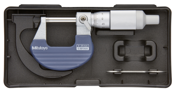 Full Description: A Mitutoyo non-digital micrometer with a combined ratchet thimble/speeder to guarantee repeatable measurement. The highly stable frame incorporates a heat shield to preserve accuracy over extended measuring sessions. High resolution provided by a vernier scale on sleeve.; Mass [g]: 180; Range [mm]: 0 – 25; Inch-Metric: Metric; Delivered: Including box, key, setting standard (from 25 mm upward), certificate of inspection; Digital/Analog: Analog; Graduation: 0.001 mm; Flatness: 0.6 ?m; Max. Permissible Error J MPE: ?2 ?m; Parallelism: 2 ?m; Measuring spindle: With spindle lock, ?6.35 mm, spindle pitch 0.5 mm; Measuring face: Carbide-tipped, micro-lap finish; Scale: Thimble and sleeve satin chrome finish, ?18 mm;Product Link: https://shop.mitutoyo.eu/web/mitutoyo/en/mitutoyo/01.02.01.04/Ratchet%20Thimble%20Micrometer/$catalogue/mitutoyoData/PR/102-707/index.xhtml