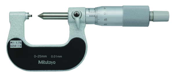 Full Description: This Screw Thread Micrometer has a fixed anvil, offering the following benefits: Fixed anvil type. It directly indicates screw pitch diameter, meaning no need for calculation. ; Stem hole ?: 37.2; Magnetic stand size (LXWXH): 25; Mass [g]: 200; Range [mm]: 0 – 25; Inch-Metric: Metric; Delivered: Including box, setting standard 60? (from 25 mm upward), key; Digital/Analog: Analog; Graduation: 0,01 mm; Measuring force: 5 – 10 N; Accuracy [?m]: ?(2+L/75) ?m, L = max. range (mm); Measuring spindle: With spindle lock, ?6,35 mm, spindle pitch 0,5 mm; Scale: Thimble and sleeve satin chrome finish, ?18 mm; Spindle feed error [?m]: 3 ; Thread to be measured (Metric/Unified): 1-1,75 mm / 24-14 TPI;Product Link: https://shop.mitutoyo.eu/web/mitutoyo/en/mitutoyo/01.02.01.048/Screw%20Thread%20Micrometer/$catalogue/mitutoyoData/PR/125-103/index.xhtml