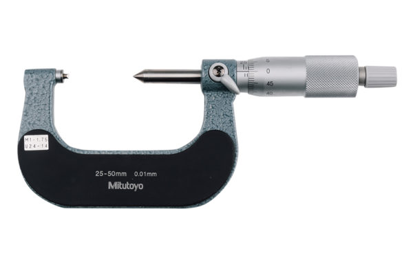 Full Description: This Screw Thread Micrometer has a fixed anvil, offering the following benefits: Fixed anvil type. It directly indicates screw pitch diameter, meaning no need for calculation. ; Stem hole ?: 62.2; Magnetic stand size (LXWXH): 32; Mass [g]: 250; Range [mm]: 25 – 50; Inch-Metric: Metric; Delivered: Including box, setting standard 60? (from 25 mm upward), key; Digital/Analog: Analog; Graduation: 0,01 mm; Measuring force: 5 – 10 N; Accuracy [?m]: ?(2+L/75) ?m, L = max. range (mm); Measuring spindle: With spindle lock, ?6,35 mm, spindle pitch 0,5 mm; Scale: Thimble and sleeve satin chrome finish, ?18 mm; Spindle feed error [?m]: 3 ; Thread to be measured (Metric/Unified): 1-1,75 mm / 24-14 TPI;Product Link: https://shop.mitutoyo.eu/web/mitutoyo/en/mitutoyo/01.02.01.048/Screw%20Thread%20Micrometer/$catalogue/mitutoyoData/PR/125-108/index.xhtml