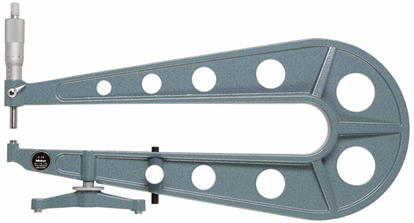 Full Description: A Mitutoyo non-digital micrometer provided with a deep frame to enable measurement of sheet metal thickness farther from the edge of a sheet than is possible with a standard micrometer. A ratchet stop guarantees repeatable measurement.; Stem hole ?: 8; Magnetic stand size (LXWXH): 84; Base size (LxWxH): 35; Clamping force (vertical): 28; Mass [g]: 2650; Range [mm]: 0 – 25; Inch-Metric: Metric; Delivered: Including box, key, setting standard (from 25 mm upward); Digital/Analog: Analog; Graduation: 0,01 mm; Measuring force: 10 – 14 N; Flatness: 1 ?m; Max. Permissible Error J MPE: ?5 ?m; Parallelism: 3 ?m; Accuracy [?m]: ?5; Min of Measuring force: 10; Max of Measuring force: 14; Measuring spindle: With spindle lock, throat depth ? 150 mm : ?6,35 mm throat depth =300 mm : ?8 mm, spindle pitch 0,5 mm; Measuring face: Carbide-tipped, micro-lap finish; Scale: Thimble and sleeve satin chrome finish, ?21 mm; Anvil / Spindle: Type A, flat/flat;Product Link: https://shop.mitutoyo.eu/web/mitutoyo/en/mitutoyo/01.02.01.065/Sheet%20Metal%20Micrometer/$catalogue/mitutoyoData/PR/118-103/index.xhtml