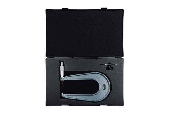 Full Description: A Mitutoyo non-digital micrometer provided with a deep frame to enable measurement of sheet metal thickness farther from the edge of a sheet than is possible with a standard micrometer. A ratchet stop guarantees repeatable measurement.; Stem hole ?: 6.35; Magnetic stand size (LXWXH): 41; Base size (LxWxH): 27.5; Clamping force (vertical): 14.5; Mass [g]: 820; Range [mm]: 25 – 50; Inch-Metric: Metric; Delivered: Including box, key, setting standard (from 25 mm upward); Digital/Analog: Analog; Graduation: 0,01 mm; Flatness: 0,6 ?m; Max. Permissible Error J MPE: ?4 ?m; Parallelism: 3 ?m; Accuracy [?m]: ?4; Measuring spindle: With spindle lock, throat depth ? 150 mm : ?6,35 mm throat depth =300 mm : ?8 mm, spindle pitch 0,5 mm; Measuring face: Carbide-tipped, micro-lap finish; Scale: Thimble and sleeve satin chrome finish, ?18 mm; Anvil / Spindle: Type A, flat/flat;Product Link: https://shop.mitutoyo.eu/web/mitutoyo/en/mitutoyo/01.02.01.065/Sheet%20Metal%20Micrometer/$catalogue/mitutoyoData/PR/118-110/index.xhtml