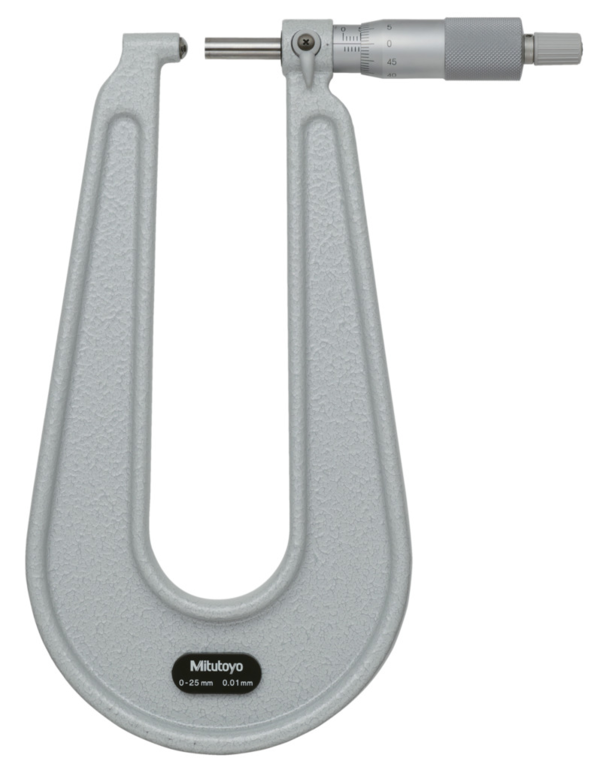 Full Description: A Mitutoyo non-digital micrometer provided with a deep frame to enable measurement of sheet metal thickness farther from the edge of a sheet than is possible with a standard micrometer. A ratchet stop guarantees repeatable measurement.; Stem hole ?: 6.35; Magnetic stand size (LXWXH): 43; Base size (LxWxH): 27.5; Clamping force (vertical): 14.5; Mass [g]: 740; Range [mm]: 0 – 25; Inch-Metric: Metric; Delivered: Including box, key, setting standard (from 25 mm upward); Digital/Analog: Analog; Graduation: 0,01 mm; Flatness: 0,6 ?m; Max. Permissible Error J MPE: ?4 ?m; Parallelism: 3 ?m; Accuracy [?m]: ?4; Measuring spindle: With spindle lock, throat depth ? 150 mm : ?6,35 mm throat depth =300 mm : ?8 mm, spindle pitch 0,5 mm; Measuring face: Carbide-tipped, micro-lap finish; Scale: Thimble and sleeve satin chrome finish, ?18 mm; Anvil / Spindle: Type B, spherical/flat;Product Link: https://shop.mitutoyo.eu/web/mitutoyo/en/mitutoyo/01.02.01.065/Sheet%20Metal%20Micrometer/$catalogue/mitutoyoData/PR/118-114/index.xhtml