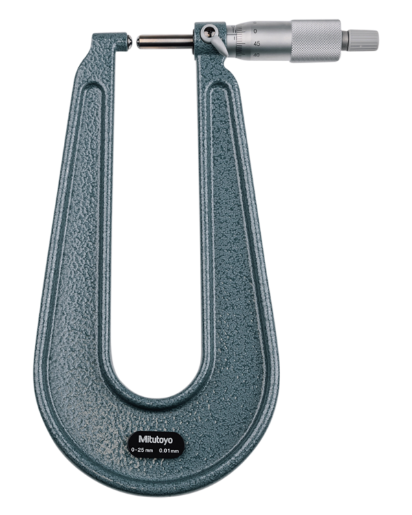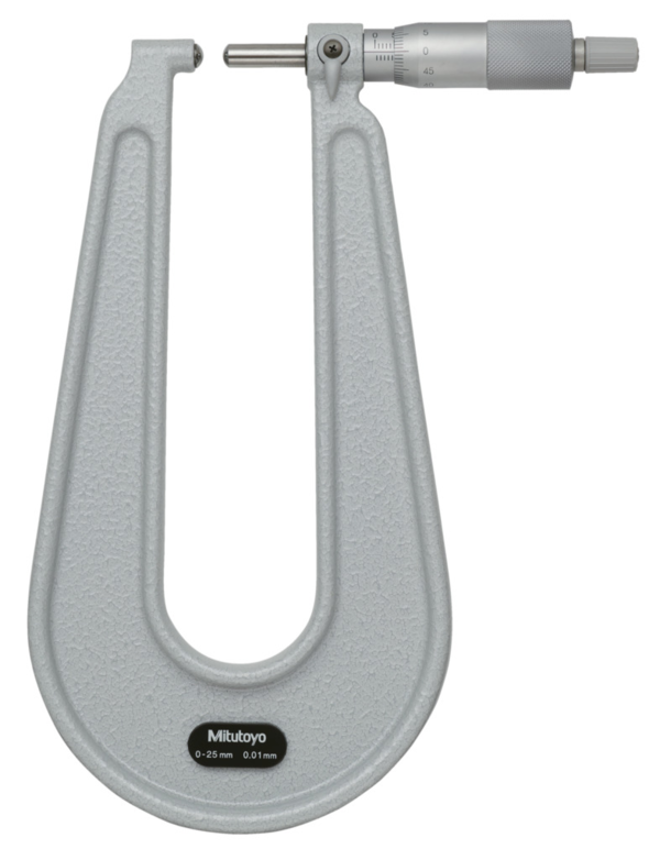 Full Description: A Mitutoyo non-digital micrometer provided with spherically radiused spindle-end and anvil and a deep frame to enable measurement of sheet metal thickness further from the edge of a sheet than is possible with a standard micrometer. A ratchet stop guarantees repeatable measurement.; Stem hole ?: 6.35; Magnetic stand size (LXWXH): 43; Base size (LxWxH): 27.5; Clamping force (vertical): 14.5; Mass [g]: 740; Range [mm]: 0 – 25; Inch-Metric: Metric; Delivered: Including box, key, setting standard (from 25 mm upward); Digital/Analog: Analog; Graduation: 0,01 mm; Flatness: 0,6 ?m; Max. Permissible Error J MPE: ?4 ?m; Parallelism: 3 ?m; Accuracy [?m]: ?4; Measuring spindle: With spindle lock, throat depth ? 150 mm : ?6,35 mm throat depth =300 mm : ?8 mm, spindle pitch 0,5 mm; Measuring face: Carbide-tipped, micro-lap finish; Scale: Thimble and sleeve satin chrome finish, ?18 mm; Anvil / Spindle: Type C, spherical/spherical;Product Link: https://shop.mitutoyo.eu/web/mitutoyo/en/mitutoyo/01.02.01.065/Sheet%20Metal%20Micrometer/$catalogue/mitutoyoData/PR/118-118/index.xhtml